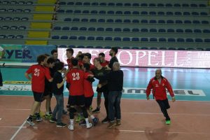 azzi di Zingoni sono determinati e convinti, vanno sotto 0-2 ma dopo questa breve sbavatura e’ un monologo biancorosso che infiamma il PalaParenti. I ragazzi si sciolgono e adesso fanno vedere un’ottima pallavolo: entra il prezioso Pantani per un positivo Coltelli, Polidori sciorina colpi sopraffini e con Bottari e Montini va in scena la rappresentazione di “The Wall”, Riposati e Anselmi continuano la loro opera di demolizione mentre in seconda linea spadroneggia uno scattante e grintoso Li Vecchi, si arriva così sul 24-19: Riposati mette a terra una palla di seconda ed è apoteosi! Con I protagonisti dei primi due set Facchini e Giotti e con Puccetti con il ginocchio che fa ancora le bizze, Sljivic e Orlandi a festeggiare con i compagni: la vittoria è di tutto il gruppo! Una gioia incontenibile che coinvolge tutti, con scene di giubilo davvero commoventi.